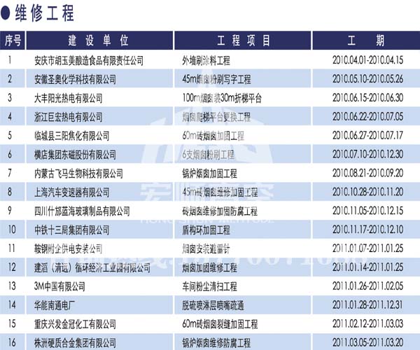 宏順建設(shè)工程有限公司是國(guó)家批準(zhǔn)成立的專業(yè)高空作業(yè)企業(yè):承攬過(guò)(國(guó)內(nèi).國(guó)外)煙囪新建、煙囪防腐、吊機(jī)防腐、水塔防腐、管道防腐、龍門(mén)吊防腐、儲(chǔ)存罐防腐、煙囪內(nèi)壁防腐等高空作業(yè)工程。具有“不搭腳手架 、 不需要停產(chǎn)”施工特點(diǎn)。